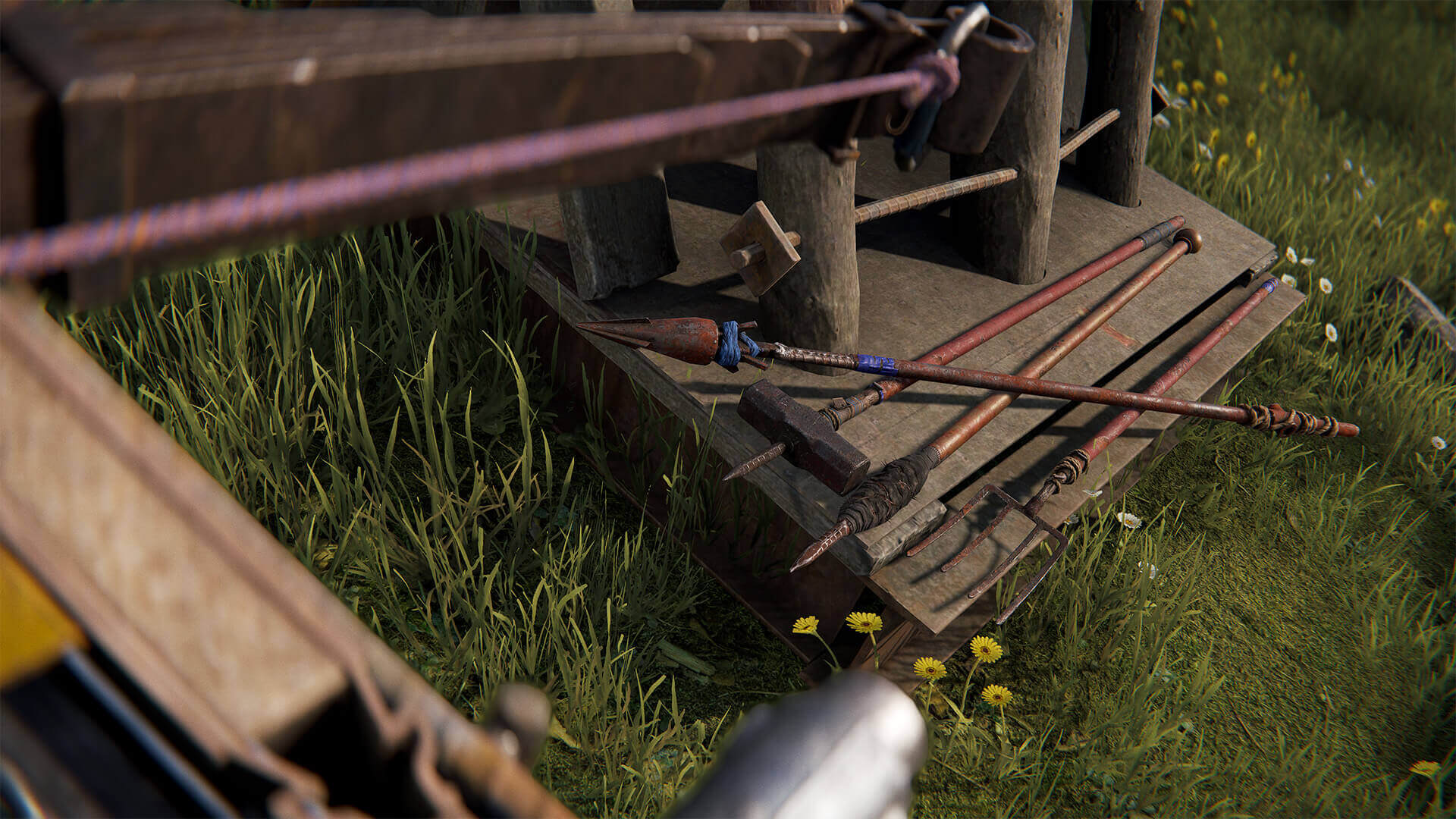 Um Belagerungswaffen zu bauen, baut ihr zuerst das Fundament und haut dann mit eurem Hammer darauf, um nach und nach den Rest aufzubauen.